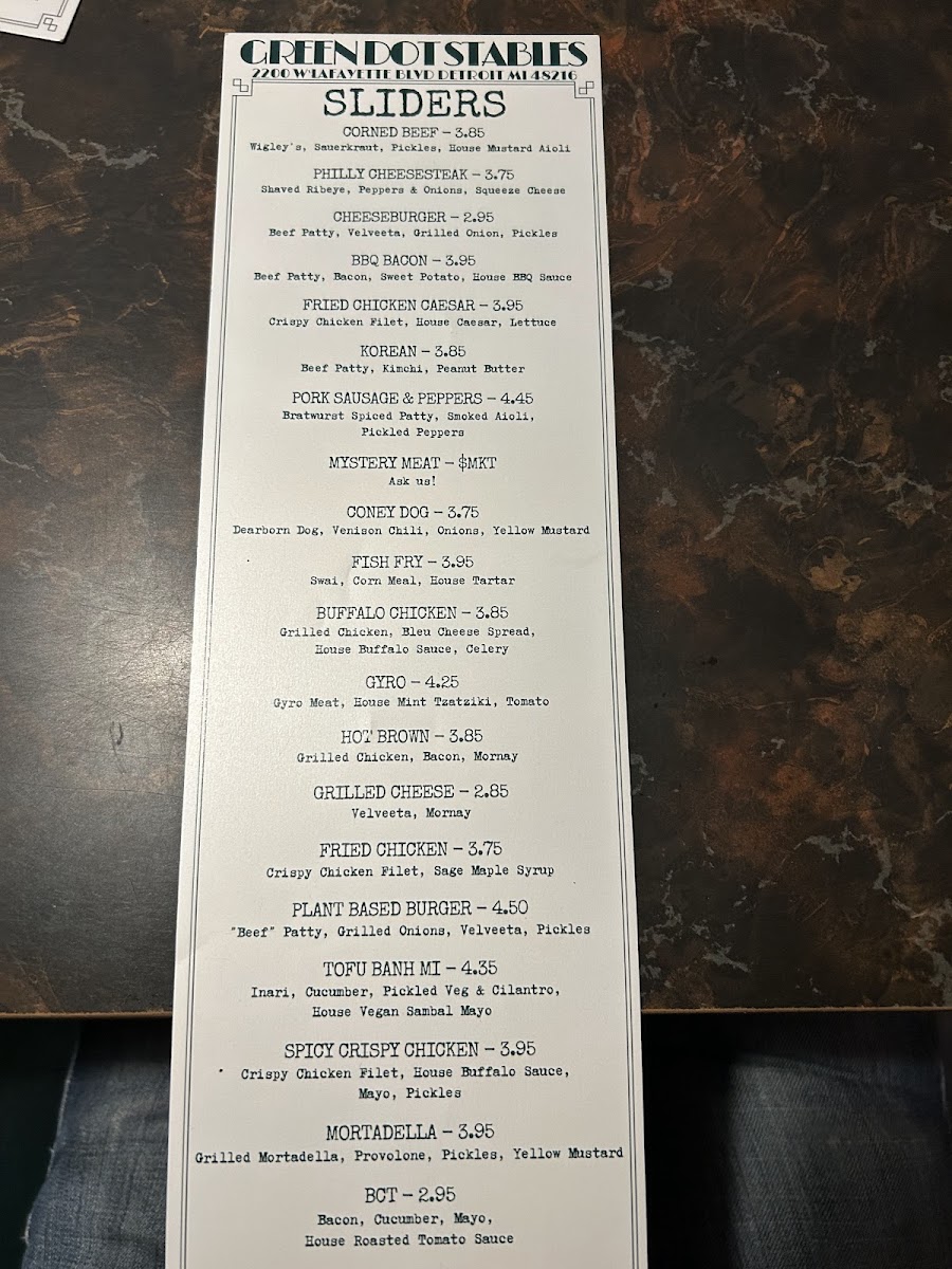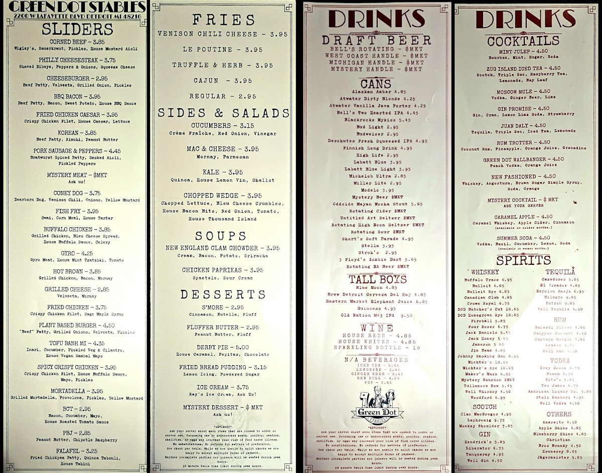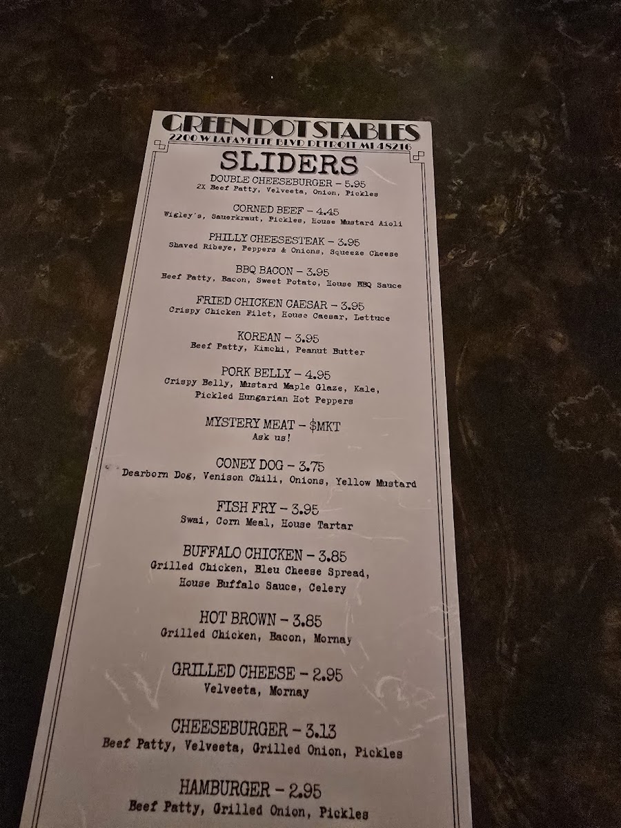 Green Dot Stables in Detroit offers a vibrant New American dining experience centered on inventive sliders and flavorful sides. Their menu shines with diverse slider options like the savory Philly Cheesesteak Ribeye and the bold Korean Beef Patty featuring peanut butter and kimchi, showcasing creative flavor blends with a modern twist. Sides such as Truffle & Herb Fries and the indulgent Venison Chili Cheese Fries complement the small plates perfectly, providing comfort and complexity in every bite.